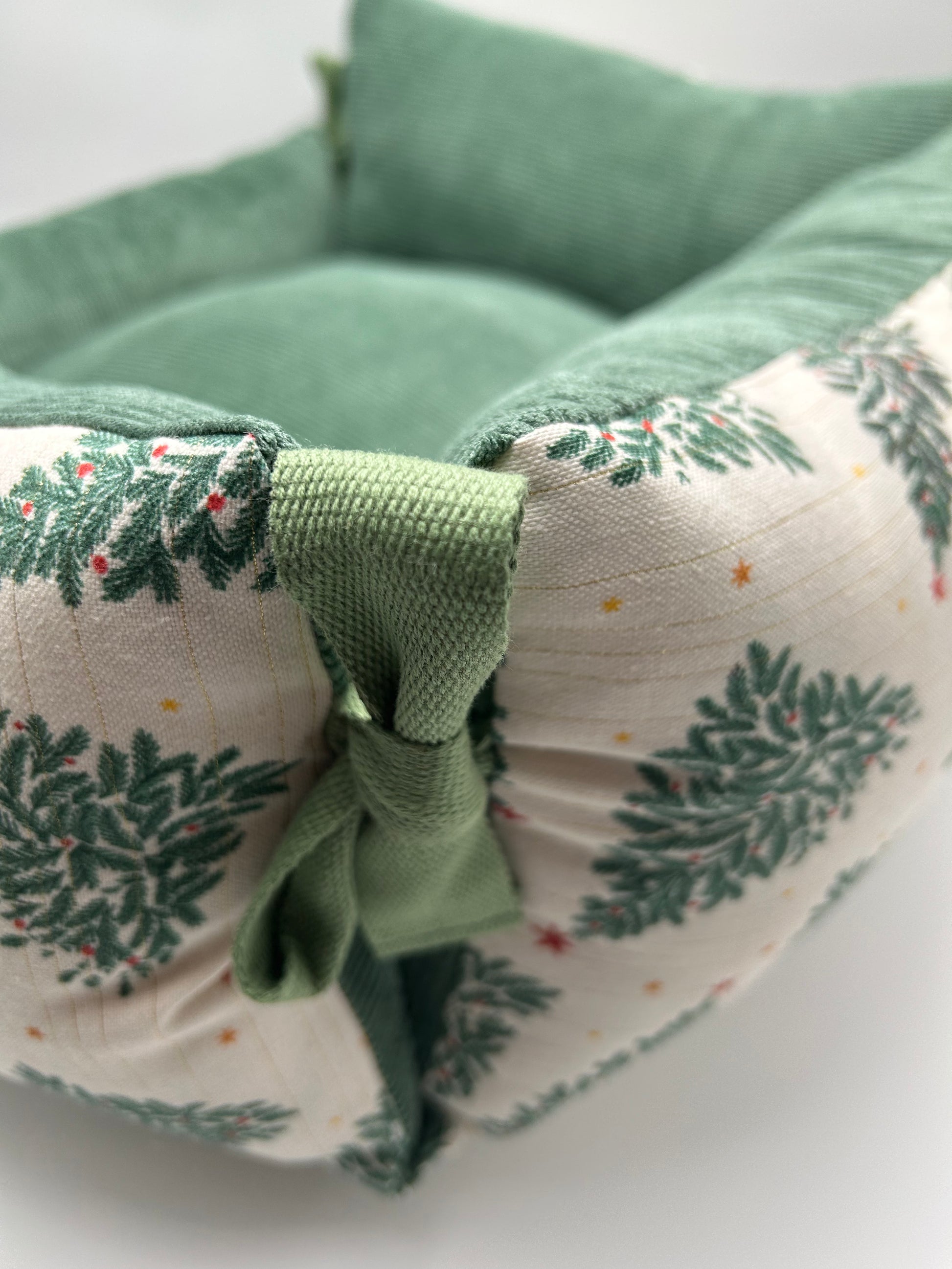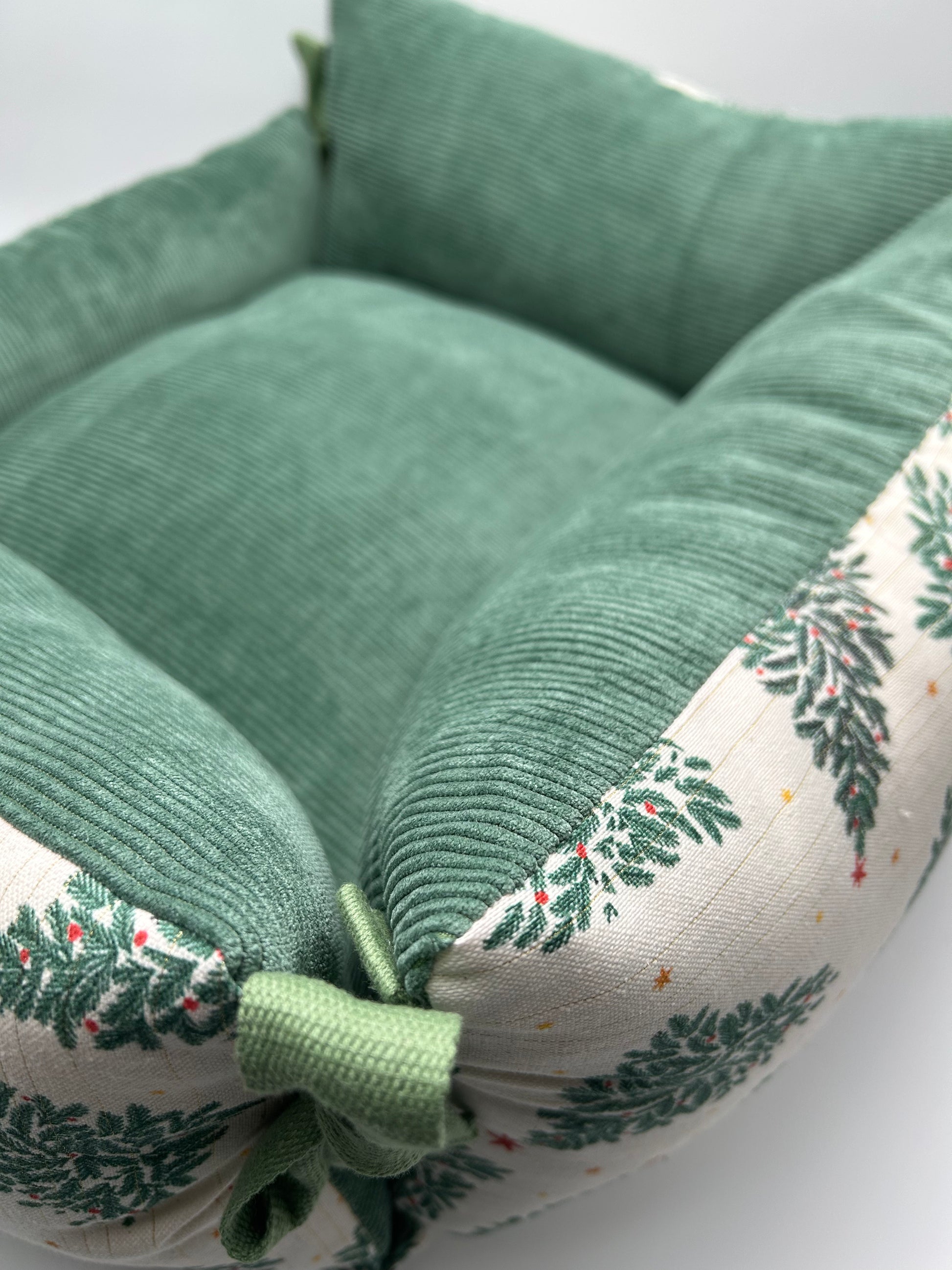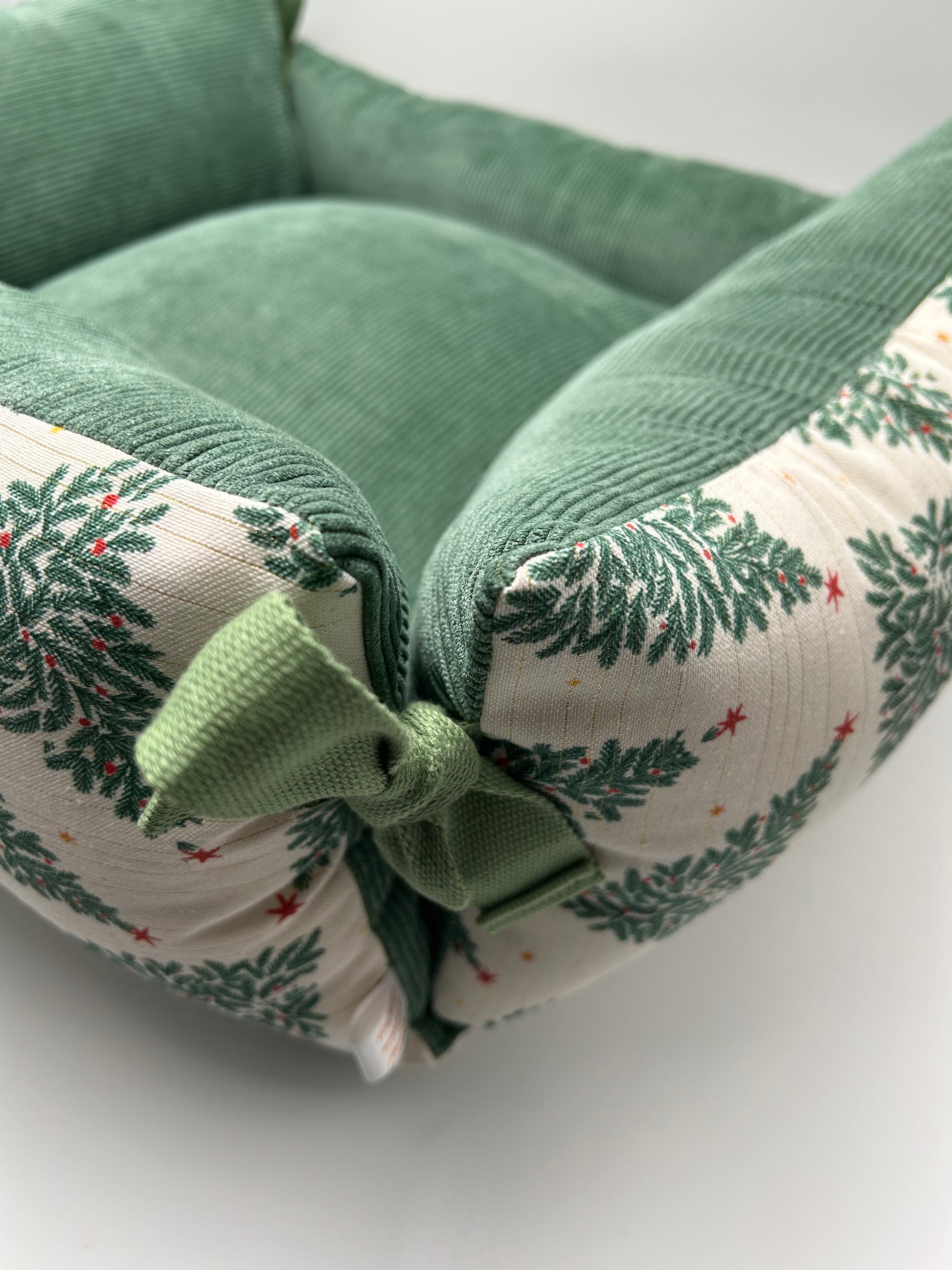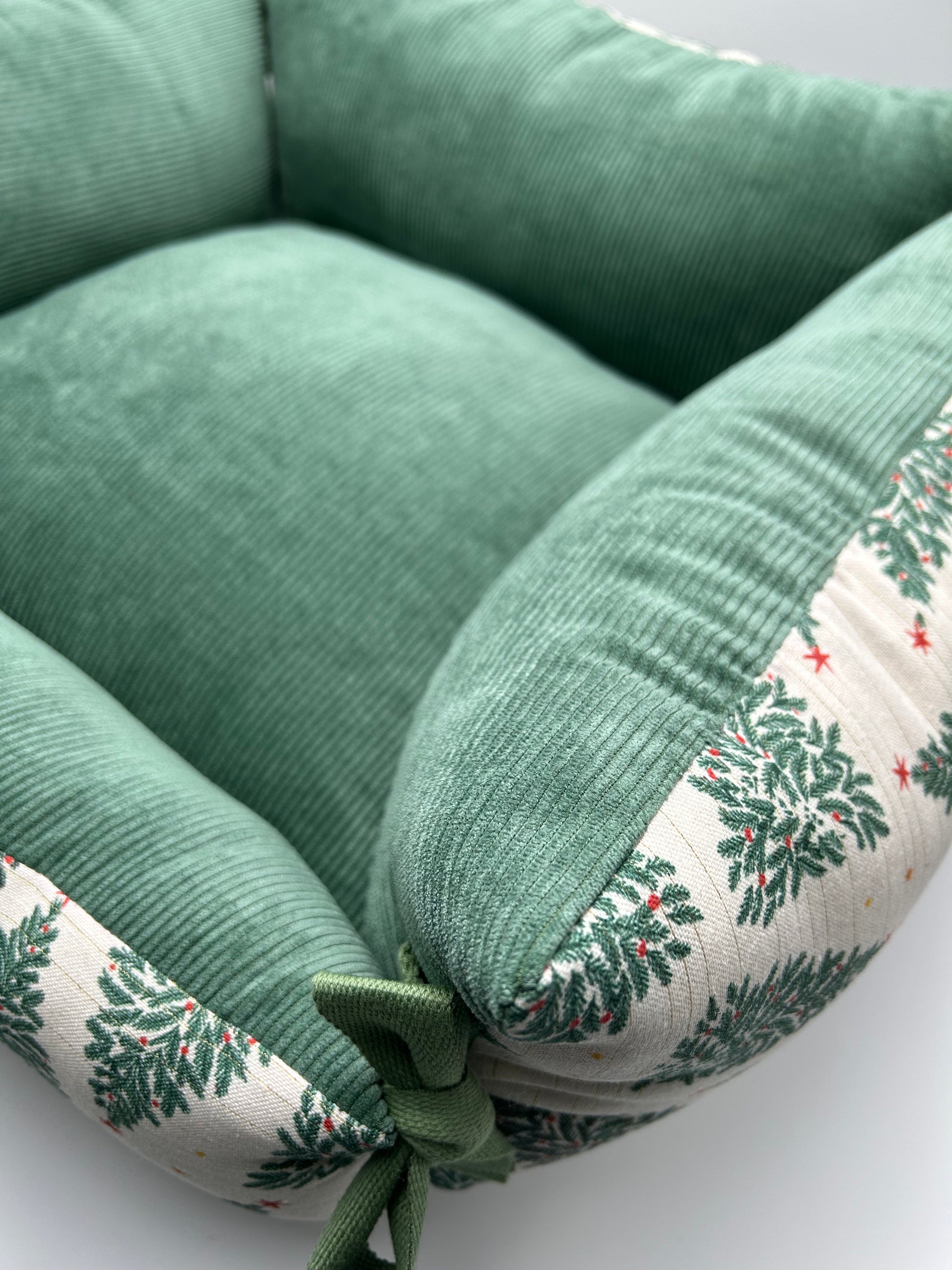 ⭐️ Dodo canapé modèle Ange, 65x55. Magnifique bachette motif sapins de Noël assortie à un épais velours côtelé vert.