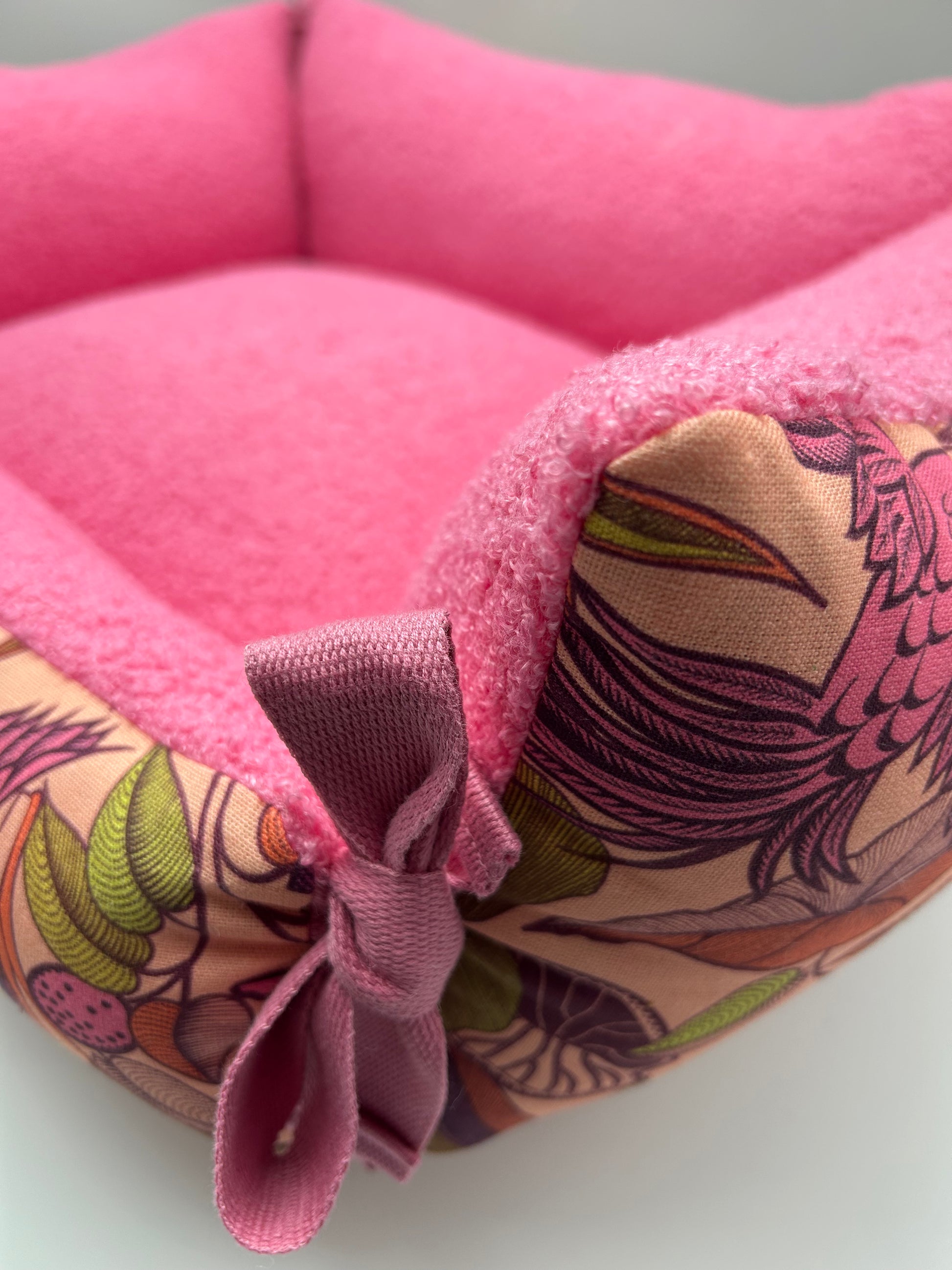 ⭐️ Dodo canapé modèle Bonnie, 65x55. Magnifique tissu bachette motif jungle assorti à un épais tissu bouclette rose.