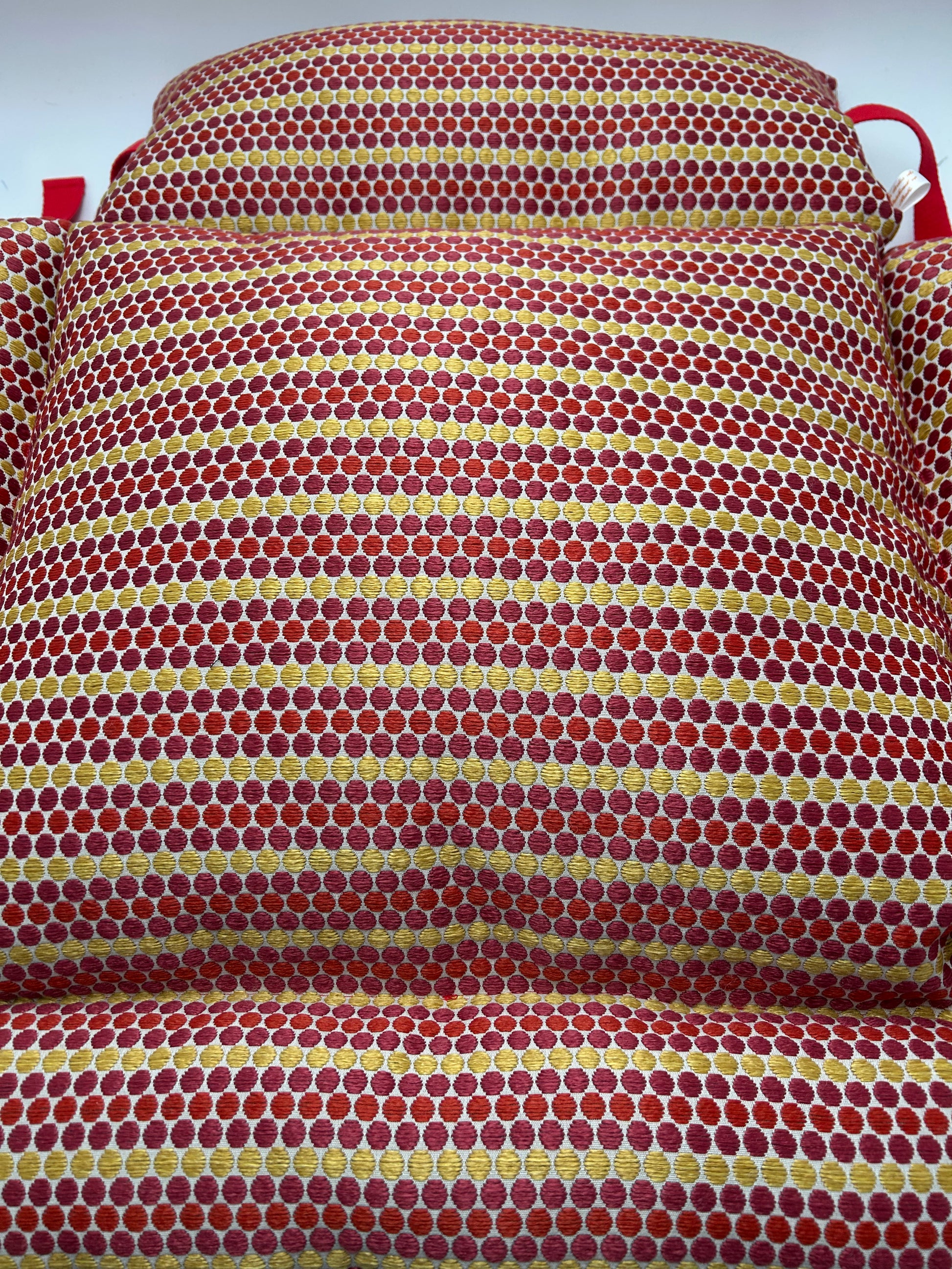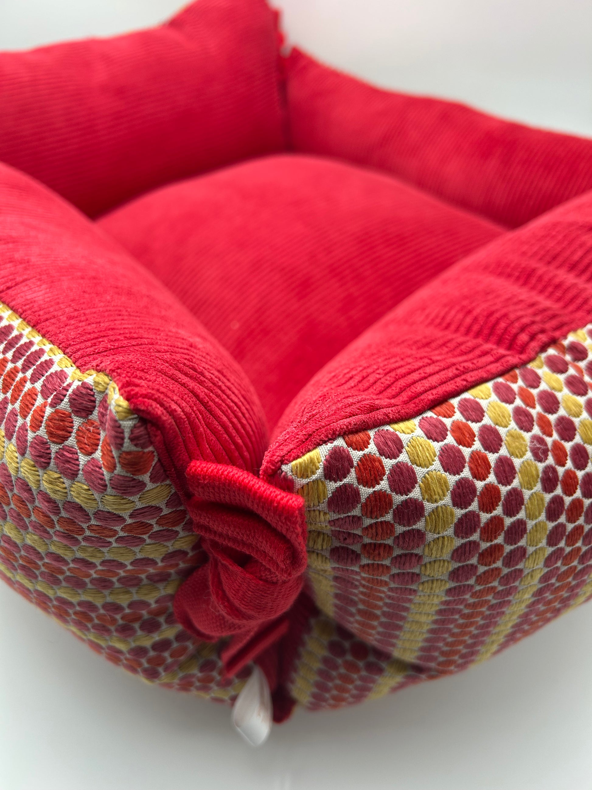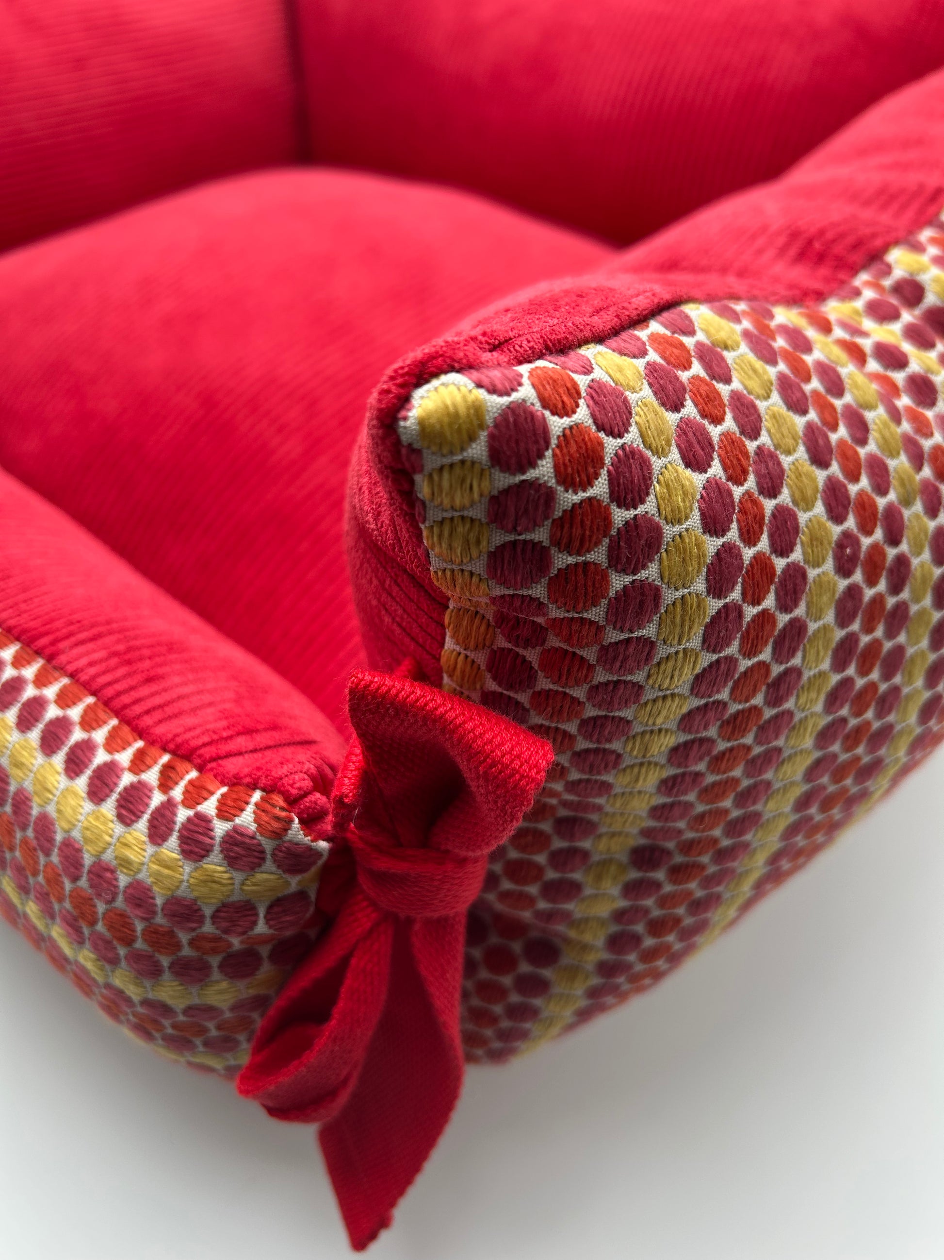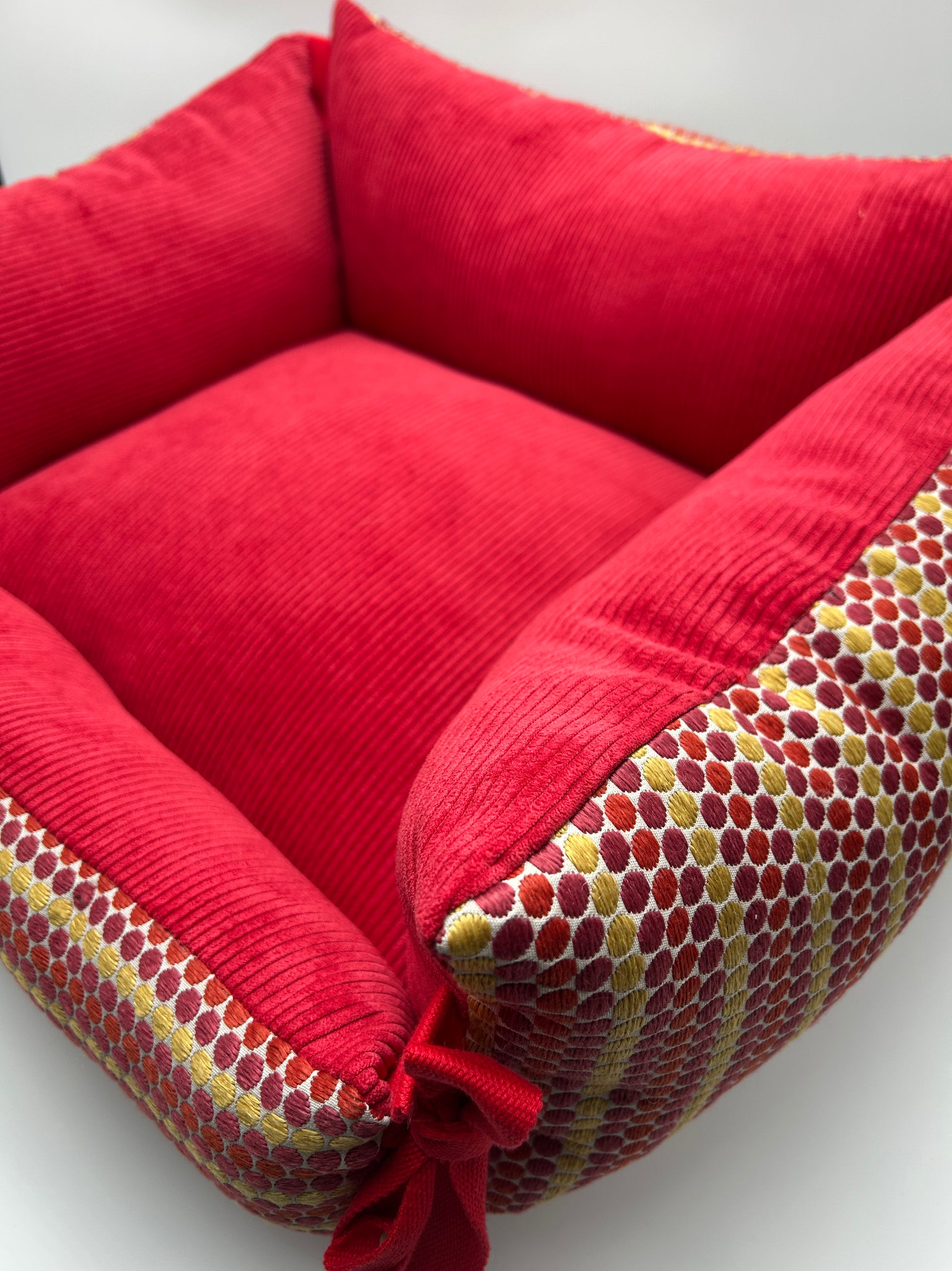 ⭐️ Dodo canapé modèle Giulia, 65x55. Magnifique jacquard fabrication française assorti à un velours côtelé couleur rouge.
