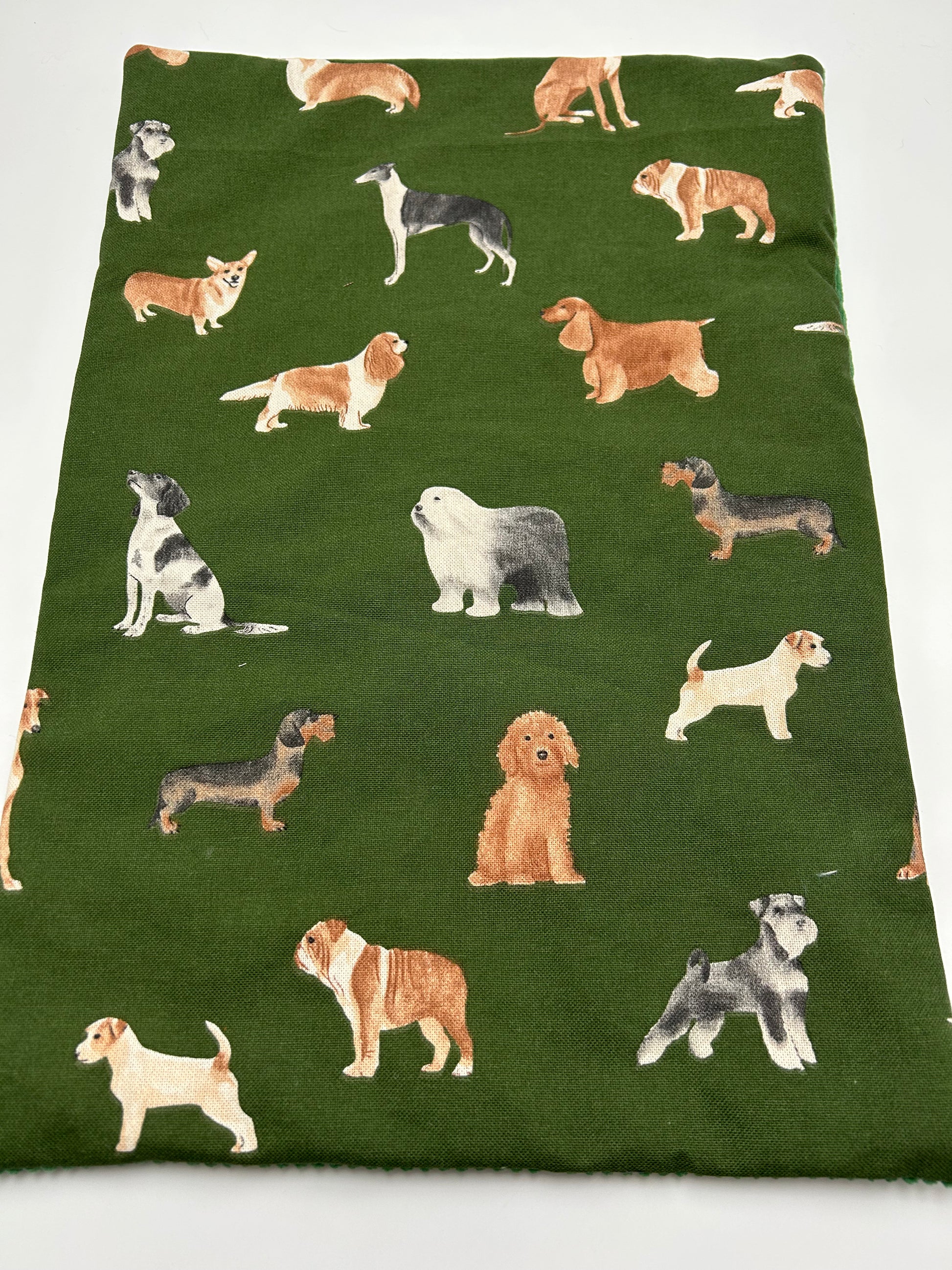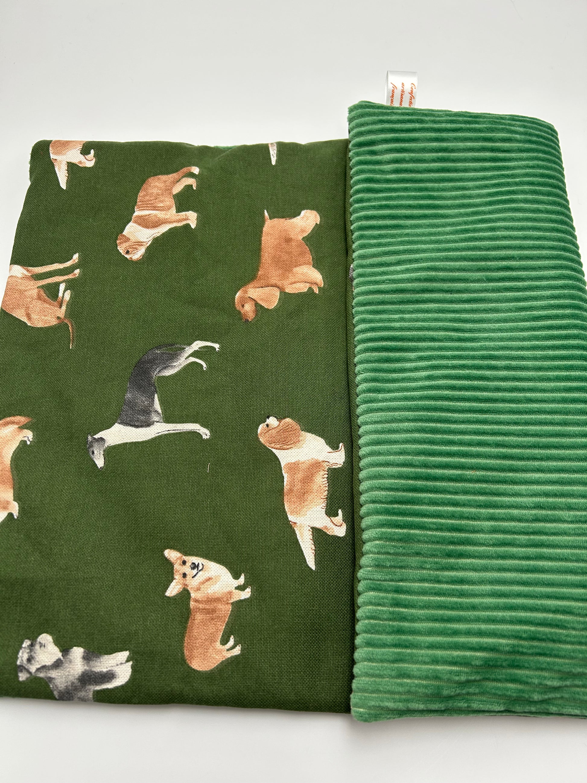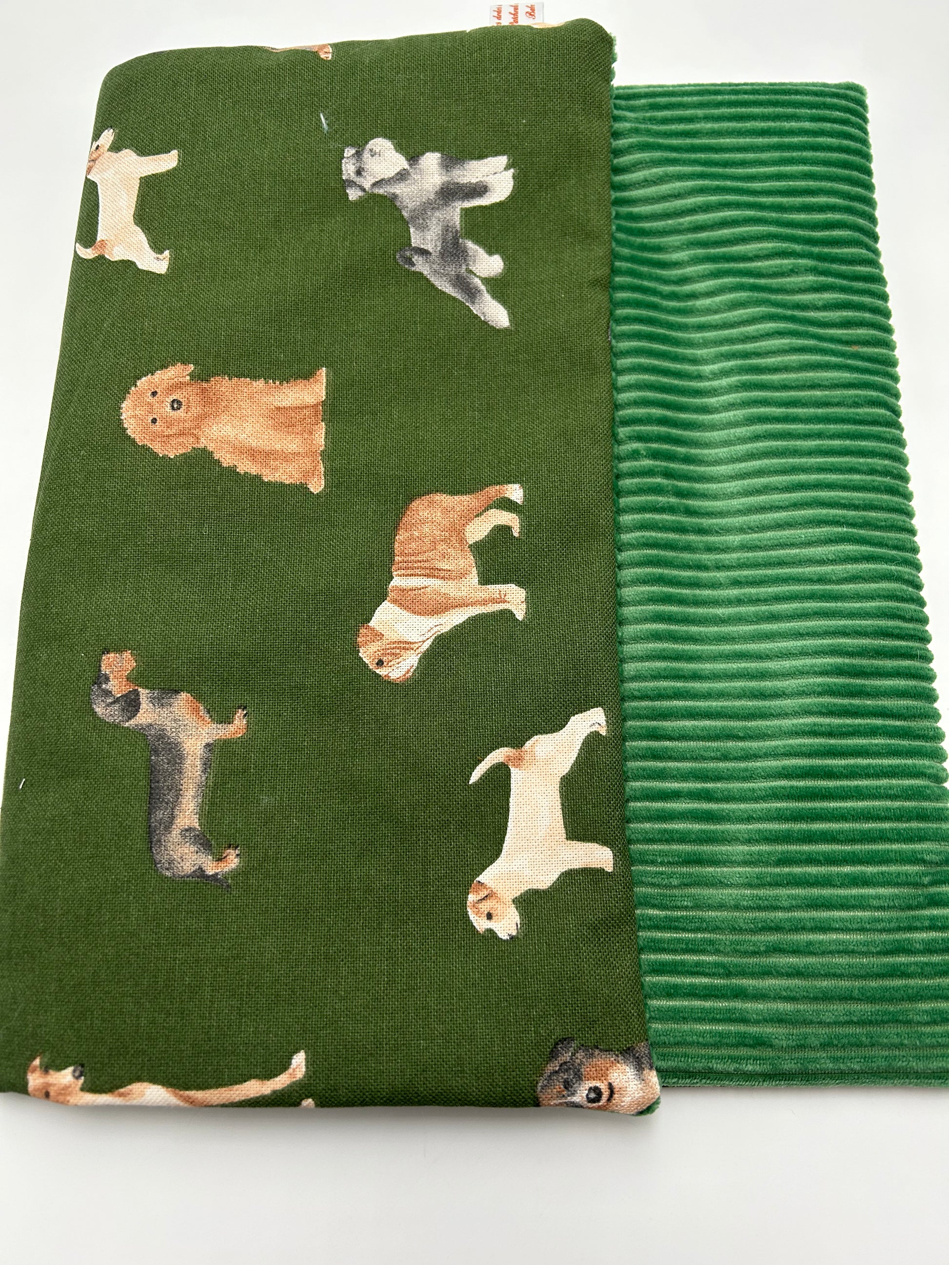 ⭐️ Petit plaid modèle Orion 2, 50x35. Magnifique tissu coton épais motif chiens, assorti à un velours côtelé vert tout doux. Doublé ouate pour encore plus de confort.